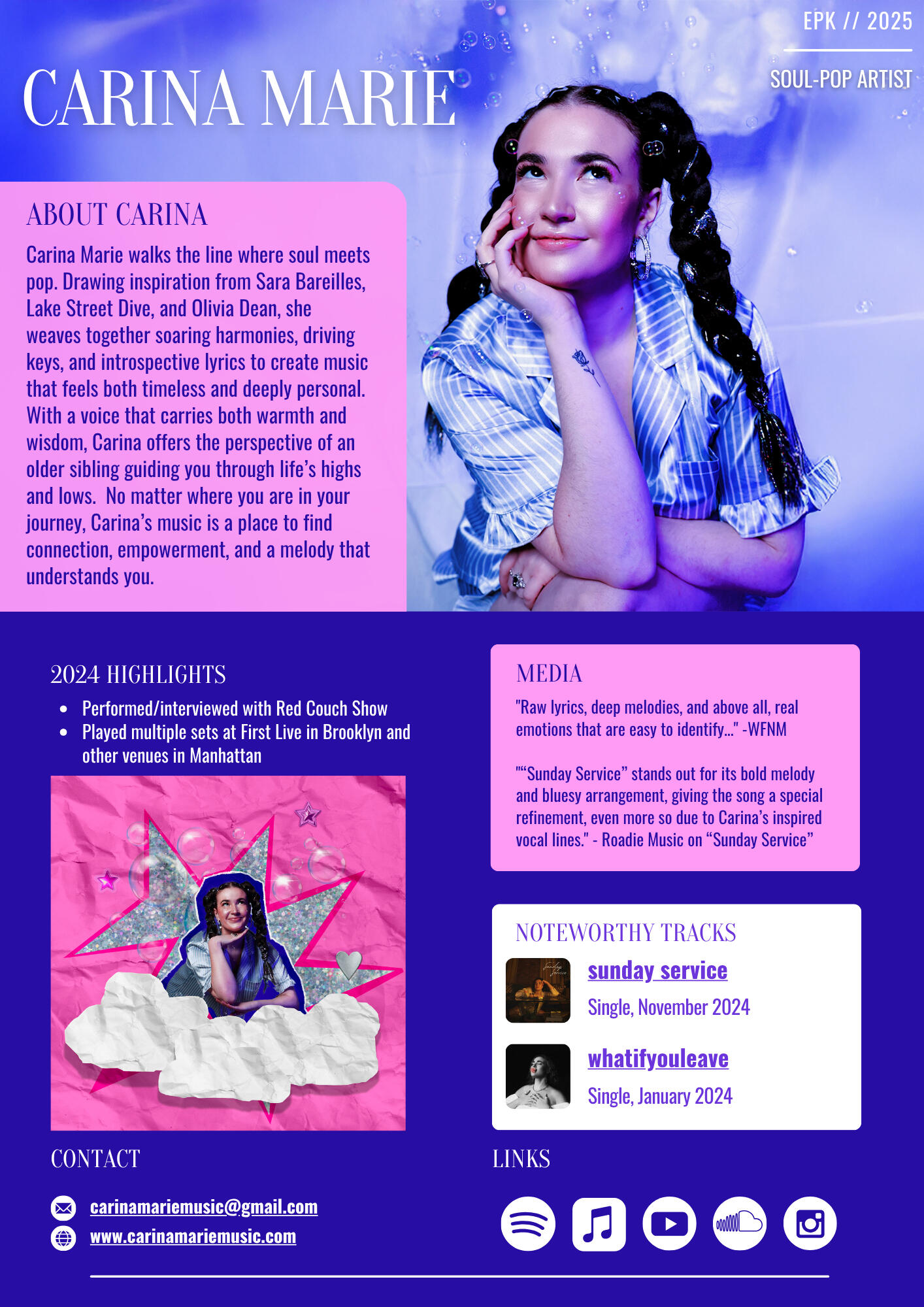 Carina Marie walks the line where soul meets pop. Drawing inspiration from Sara Bareilles, Lake Street Dive, and Olivia Dean, she weaves together soaring harmonies, driving keys, and introspective lyrics to create music that feels both timeless and deeply personal.